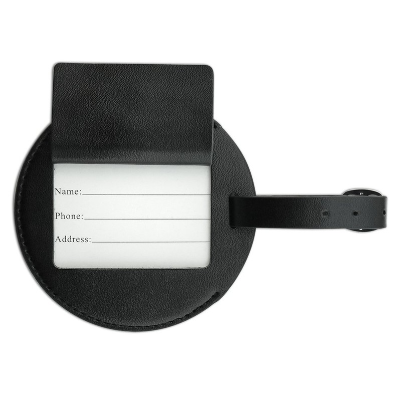 - QUALITY MATERIAL: Our stylish tag is crafted with a leather backing and strap, and a durable PU front. The featured design is displayed on one side, with a slip pocket and privacy flap on the other. Includes contact information card. Approximately 4.0" (10.2cm) in diameter.