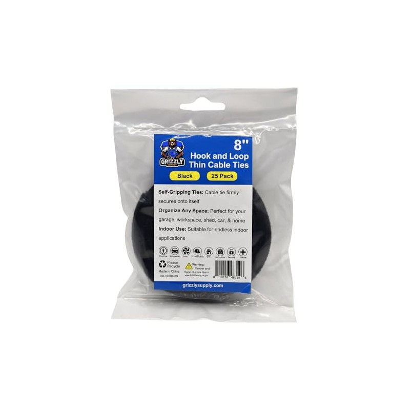 - Grizzly Supply’s 8" Black Back to Back Hook and Loop Cable Ties deliver secure and reusable bundling