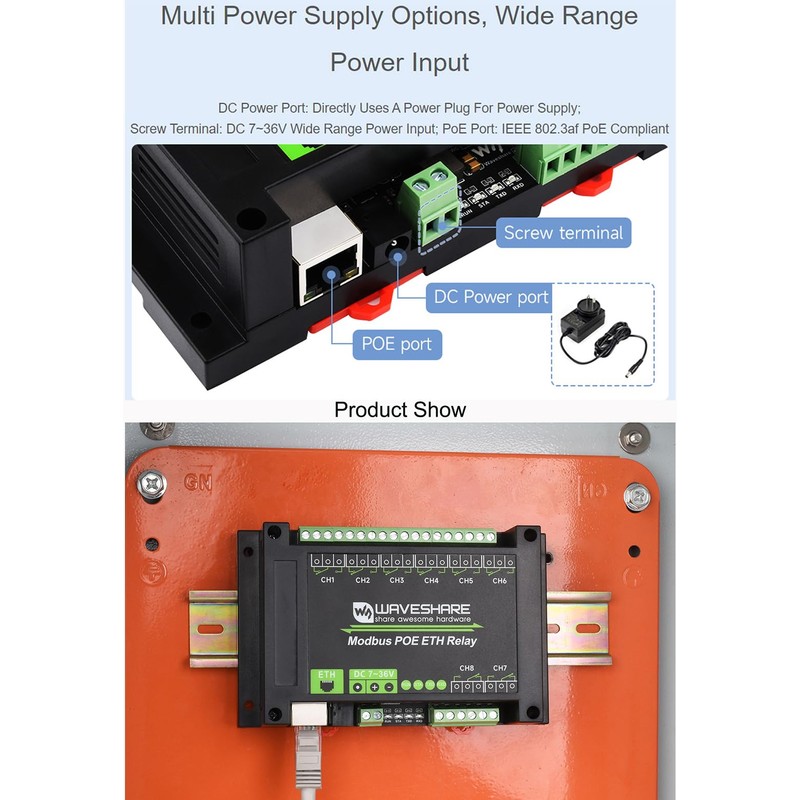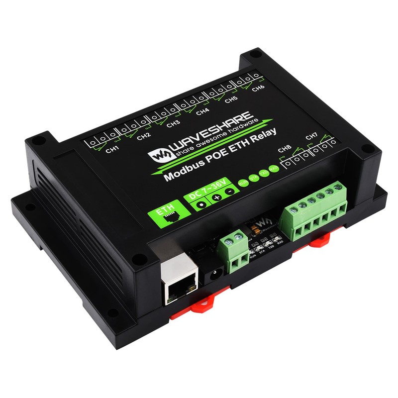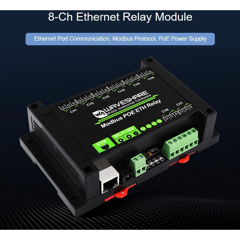 - This product is an industrial 8-ch relay module controlled via Ethernet port, adopts Modbus RTU/Modbus TCP protocols, supports PoE power supply, also comes with an ABS rail-mount case.