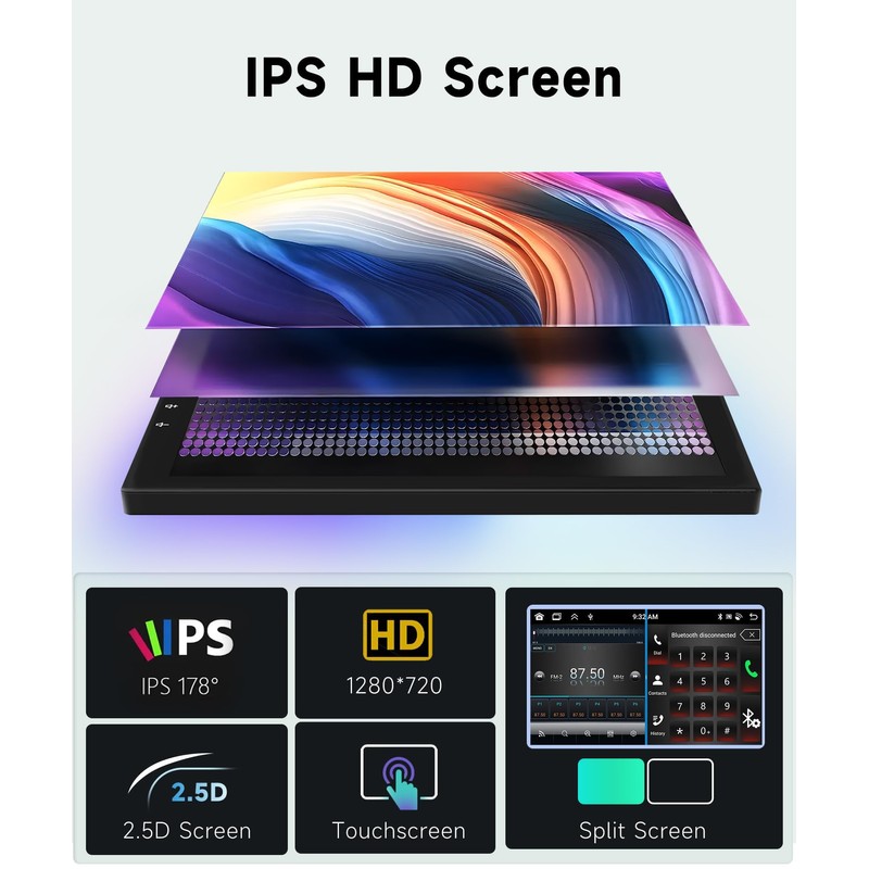 - More Features: GPS navigation; built-in WiFi, support online and offline maps; Bluetooth hands-free call and music; Steering Wheel Control; mirroring link; FM RDS radio; subwoofer output; Dual USB ports; Dual Mic; Customize UI interface; Split screen