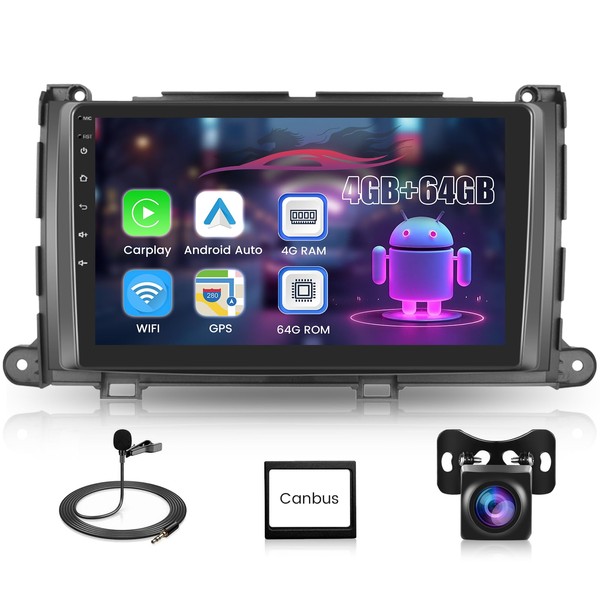 8 Core 4G+64G Car Stereo for Toyota Sienna 2011 2012 2013 2014 5G WiFi Wireless Carplay Android Auto DSP, 9-Inch 1280P Touch Screen Car Radio with BT5.0 Mirror Link GPS +Rear View Camera