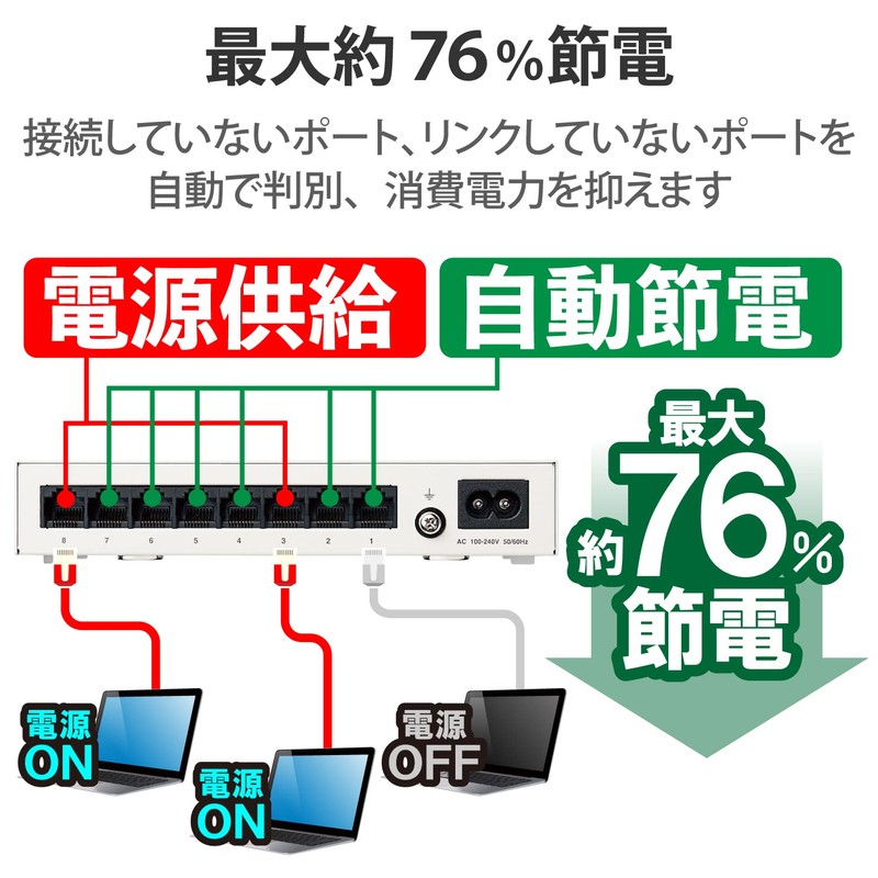 - This is a 8-port hub with a built-in power supply metal housing that cuts power supply to ports when not communicated; It can save up to 76% of energy by up to 1000 BASE-T compatible. The measurements were taken by transferring data from the load unit to the hub, and comparing power 1 minute after all ports and non-communications