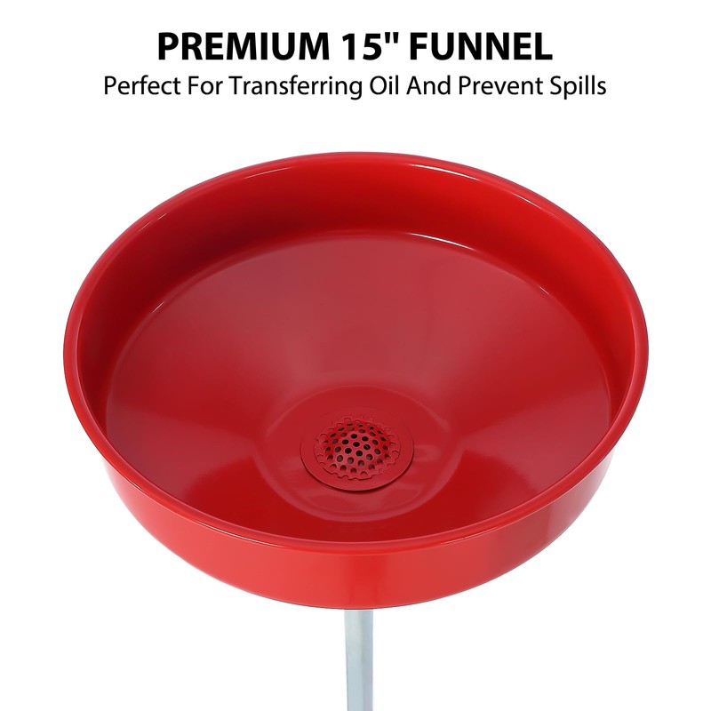 - UPGRADED FUNNEL: The oil drain pan features a funnel-shaped design with a 15-inch diameter to prevent waste oil spills. Made of high-quality steel with powder coated surface, sturdy and rust-resistant.