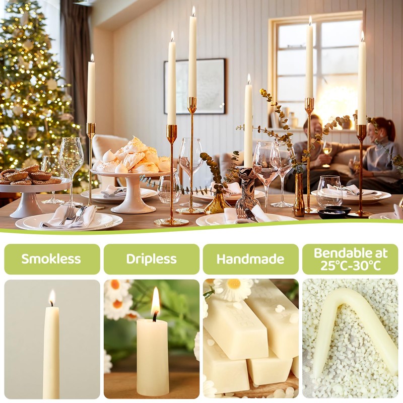 - Non-toxic Dripless and Smokeless Beeswax Taper Candles:We are dedicated to creating products that are good for people as well as the planet!The wicks are made of 100% cotton,lead-free.pure bees wax taper candles burns evenly and cleanly,has a high melting point outer coating to prevent any unnecessary wax dripping,stable flame,contains no heavy metals or toxic chemicals,can be safely stored around your family or pets when not in use