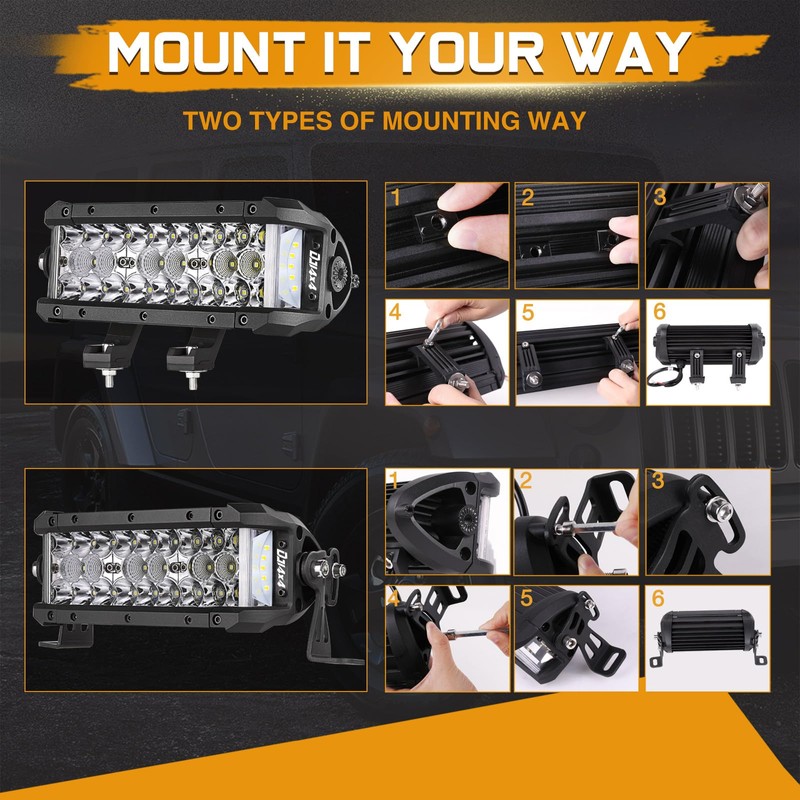 • Side Shooter Design -- Previously unimagined more LED chips on dual outer sides design to illuminate the broadest viewing area. Up and down dual row 150° flood light surrounded by middle 30° spot light, this combo beam light bar is engineered to take the lighting visibility to the newest height (Over 180 degree). Dramatically improving your safety on trail or race course.