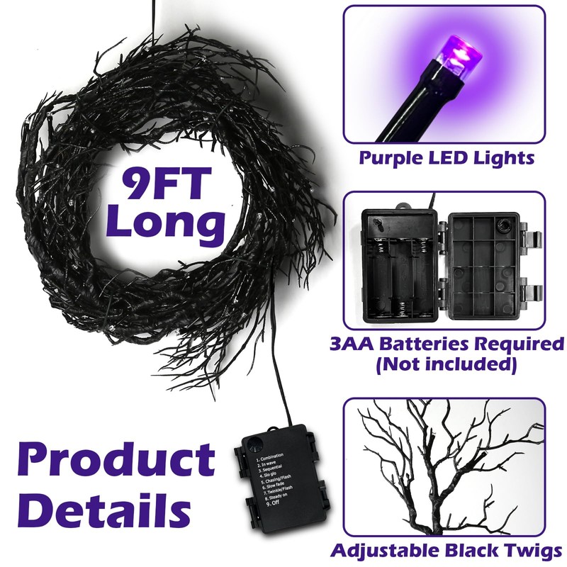 - [ Halloween Willow Vine Decorations ] 9 Ft Long Realistic Halloween light up Garland with 66 LED purple lights, total 22 big branches and 66 small branches