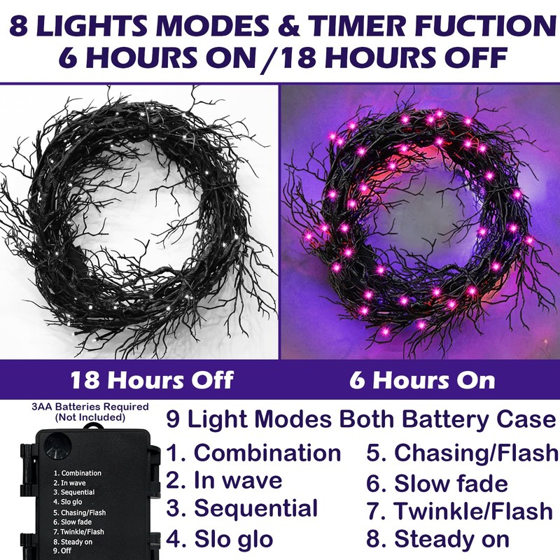 - [ Timer & Battery Operated ] Press the Halloween garland battery box button, the light will be automatically timed and keep on for 6 hours, automatically turn off for 18 hours, With black waterproof battery box,Powered by 3 AA batteries(not included)