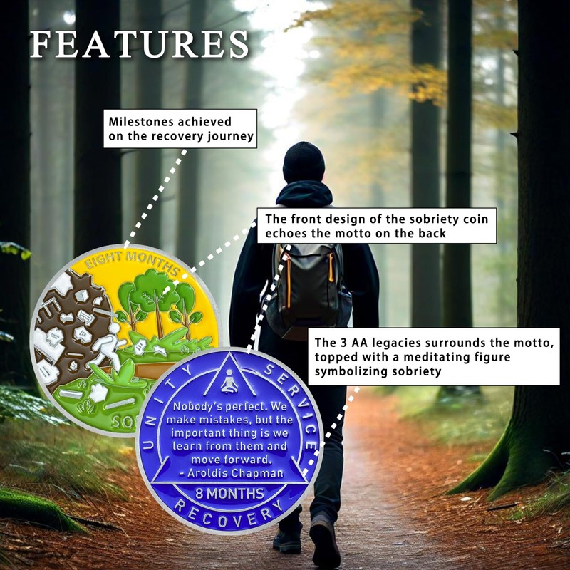 - 【Celebrate 8 Months of Resilience in Sobriety】This unique sobriety coin honors your 8-month commitment to a sober lifestyle. The front of the recovery medallion proudly displays the engraving “EIGHT MONTHS,” symbolizing a significant milestone on your recovery journey. Carry it as a token of strength and as a reminder of the progress you’ve made so far.