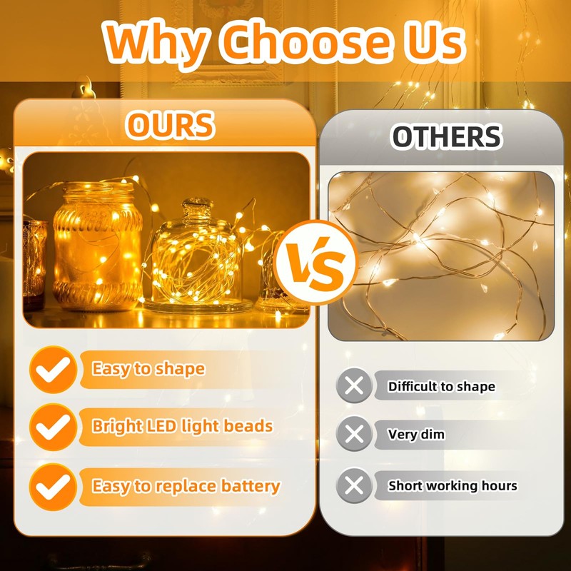 - 【Widely Applicable】2M 20LED fairy light string, emits soft, bright and warm white light, very suitable for Christmas, party, patio, desktop, Halloween, Valentine's Day and other holiday decorations