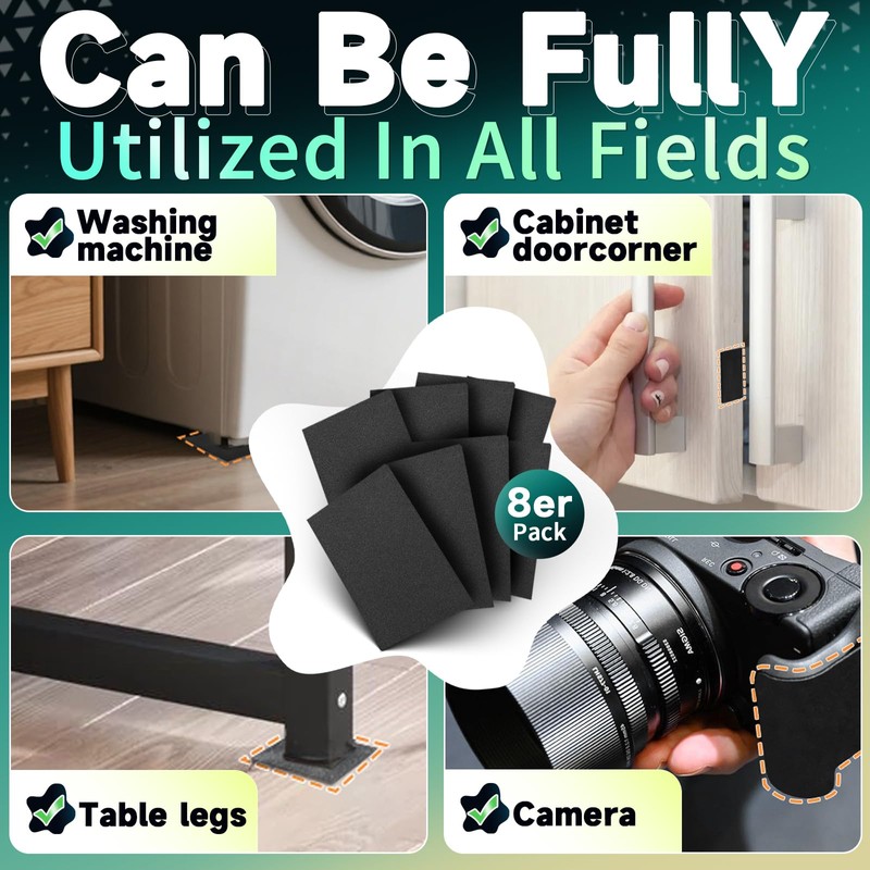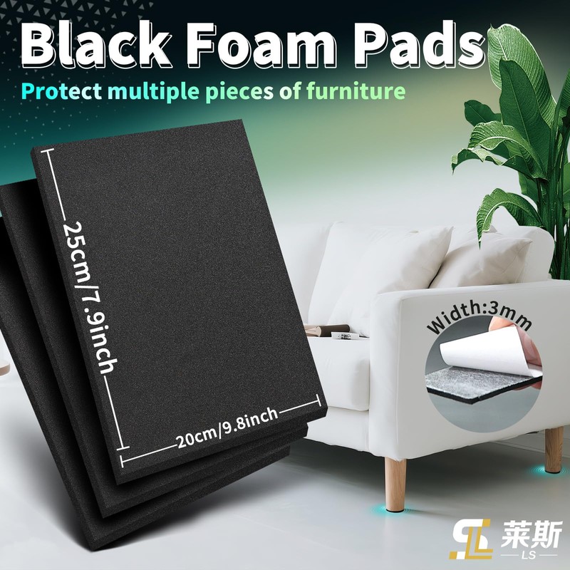 8 Pack black cell foam pads (25x20x0.3cm) feature a strong adhesive backing that securely adheres to smooth surfaces (metal/glass/plastic) without residue. Suit for reducing appliance vibration noise, cushioning tool handles/furniture edges, and DIY projects. Waterproof, non-slip for indoor/outdoor use. Apply to clean, dry surfaces