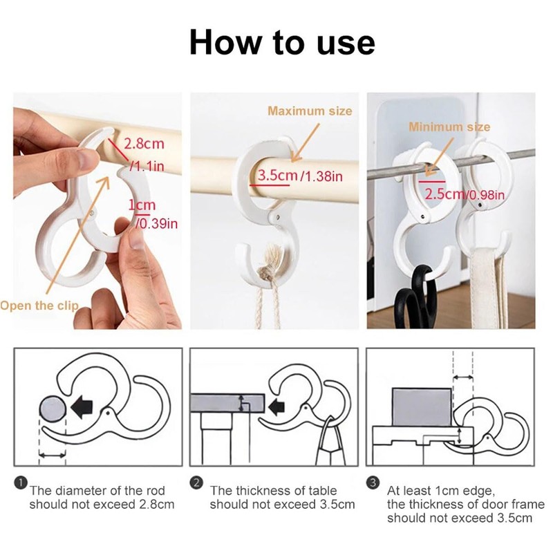 These Adjustable S shaped hooks for table edge, wardrobe, garden, kitchen, balcony, living room. You can choose the size of the hook ring according to the diameter of the suspension crossbar to better adapt to the size of the crossbar.