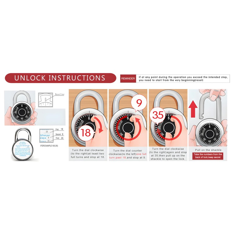 - Easy Setup Instructions: The lock provides detailed instructions on the back for setting up the combination. Follow them carefully for the first-time setup.