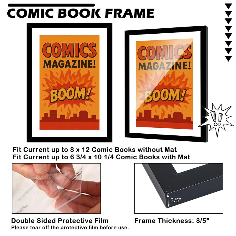- Product includes 4 pack 8x12 inch black comic book frames with 6 3/8"x9 5/8" inch mat, fit current comic books up to 6 3/4" x 10 1/4" with mat and 8x12 inch pictures photos magazines documents standard comic books without mat.
