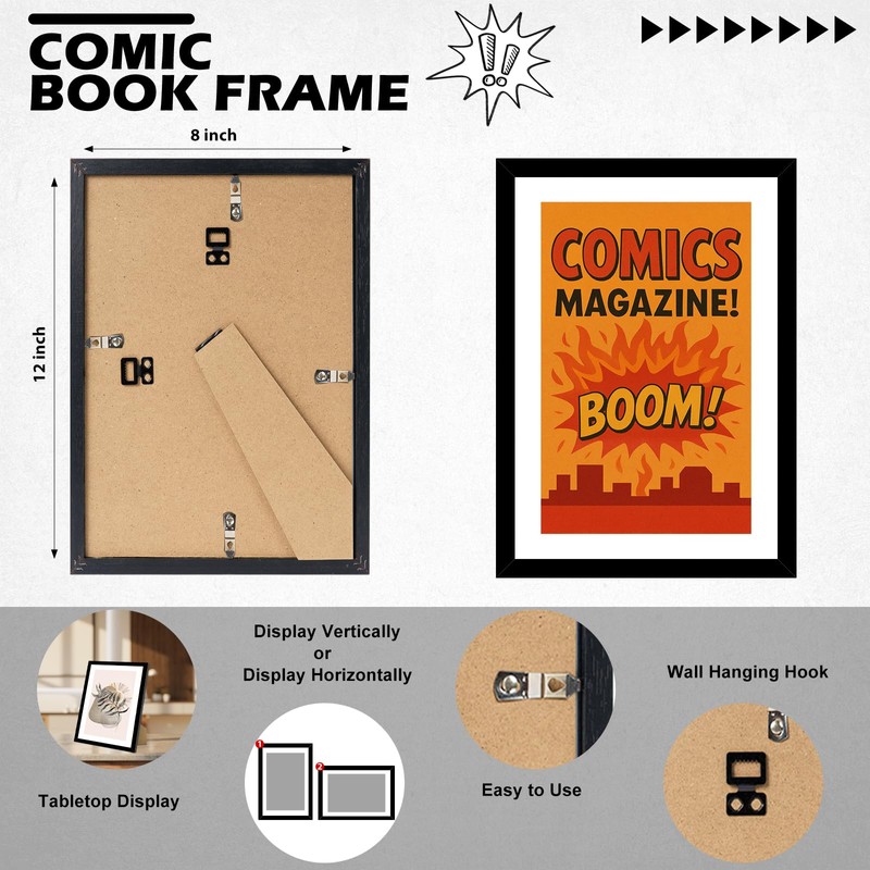 - Elegant Wall Decor: This 8x12 inch black comic book frame with 6 3/8"x9 5/8" inch mat is designed for wall hanging and tabletop display, adding a touch of modern style to any room. Its wood grain black frame and high-quality wood construction make it a perfect choice for displaying your cherished memories.