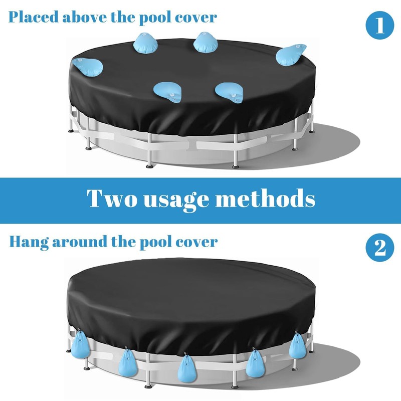 • Easy Installation: The pool water bags are designed to securely hold the pool cover in place and prevent it from being blown around. With 8 sturdy buckles, the pool cover weights can be easily fastened, making installation simpler and reducing the risk of them coming loose. Keep your pool clean by ensuring the cover stays flat and free from leaves, water, debris, and other unwanted materials