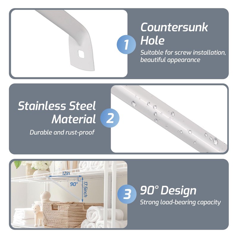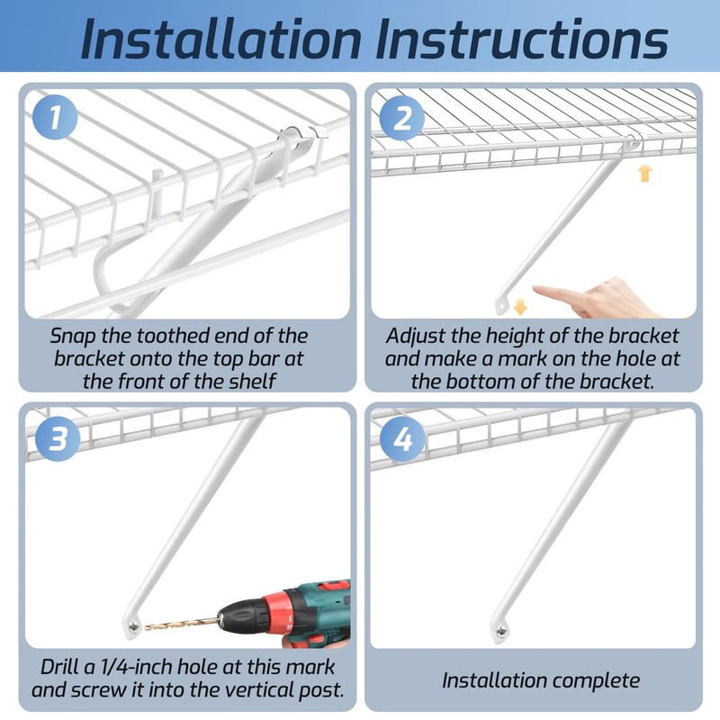 - 【Easy to Install】- This 17'' wire shelf brackets comes with all the necessary hardware and is very easy to install. Just bend the tooth end of the bracket on the top rod on the front of the rack, adjust the height of the other end and fix it to the wall through screws. The whole process is very fast and convenient. In addition, our 17-inch wire shelf brackets can be used with a 12-inch deep rack