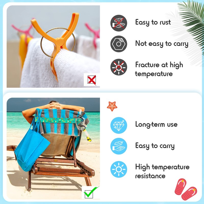 - Multiple Uses: you can use towel clips for beach chairs to secure beach towels, they can secure your shirts, blouses, notebooks, swimsuits, etc., and you can use them at the pool, on cruises, camping, vacations