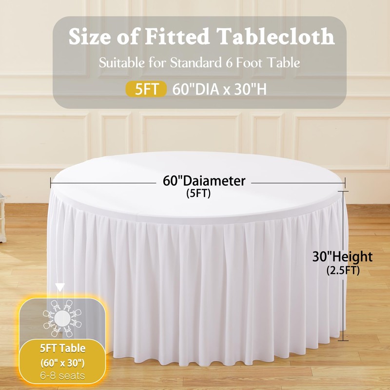 - Size: Designed specifically for 60-inch diameter, 30-inch high round tables, this white round table cloth is tailored to provide a seamless fit. It’s deep enough to allow you to store items under the table, keeping your space clean and organized.