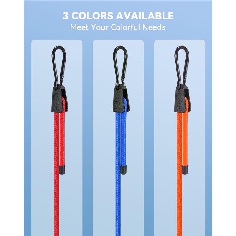 - RUST-RESISTANT CARABINER HOOKS - With electrophoretic coating technology, our hooks are more durable and rust-resistant than common carabiner hooks. Whether indoors or outdoors, our adjustable bungee cords with carabiner hooks could fasten your items firmly.