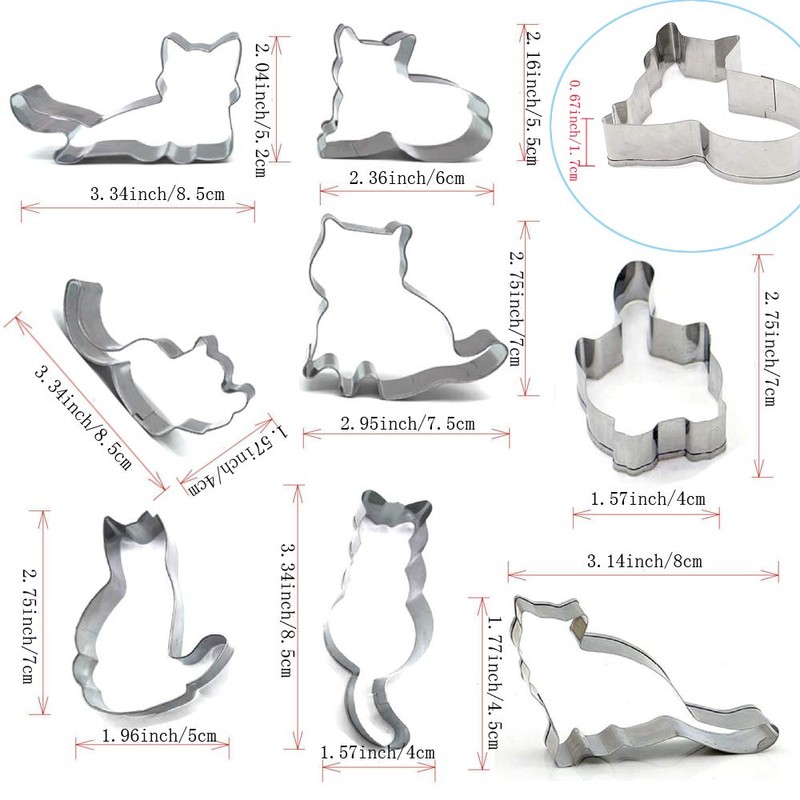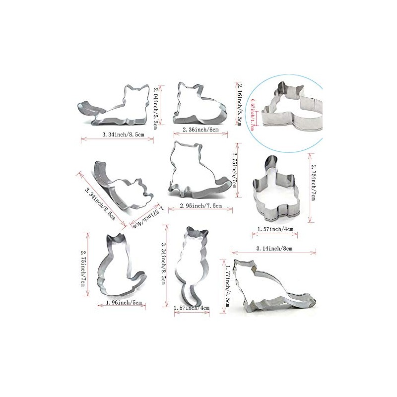 - Mini Cookie Cutters Cat Size: Cat cookie cutters size are diameter approx. 1.57 ~ 3.34 inches (See the product size chart for details), height are all 0.7 inches (1.8 cm).