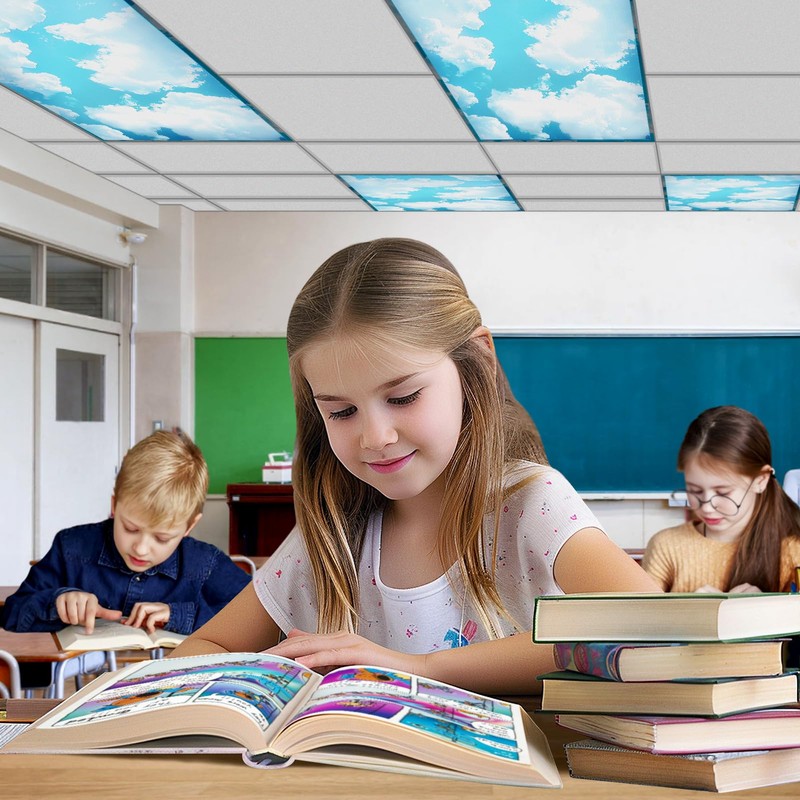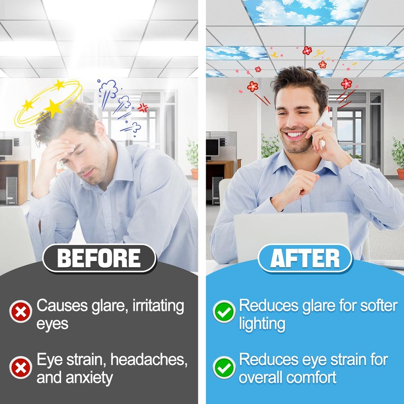 - Reduce Headaches: These blue light covers for ceiling lights classroom help reduce glare from ceiling and fluorescent lights, easing eyestrain, headaches, and anxiety. This allows for a more comfortable work or study environment. Additionally, the blue design creates a relaxing atmosphere, reminiscent of a clear blue sky.