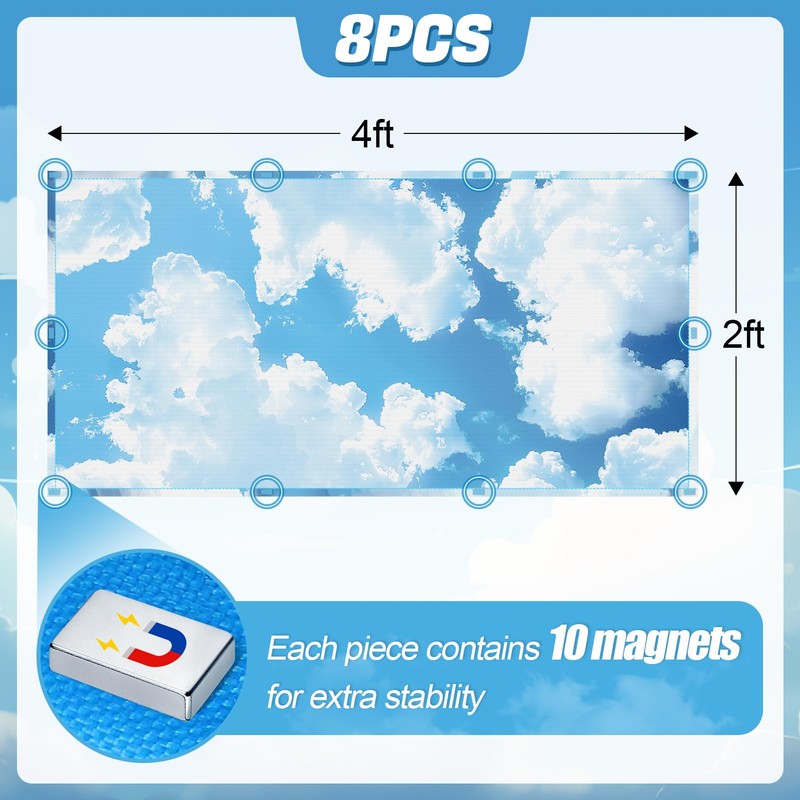 8 Pcs Fluorescent Light Covers with 10 Strong Magnets - Light Filter for Ceiling Light Classroom Office Hospital to Eliminate Harsh Glare Reduce Headache, Flame Retardant Fabric, 4 x 2 FT, Cloud