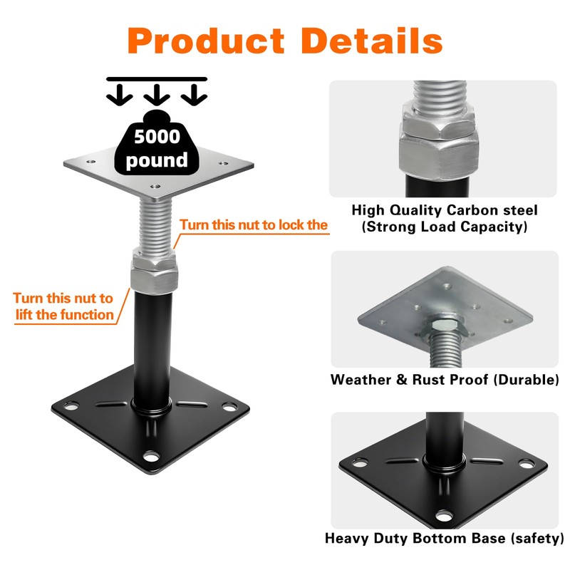 - PRO-GRADE 5000LB CAPACITY PER JACK:Engineered with heavy-duty cold-rolled steel (superior to standard iron), each screw jack withstands 5000lbs — 2.2X industry average. Galvanized + black oxide dual-layer anti-corrosion coating fights rust in crawl spaces/seaside areas.