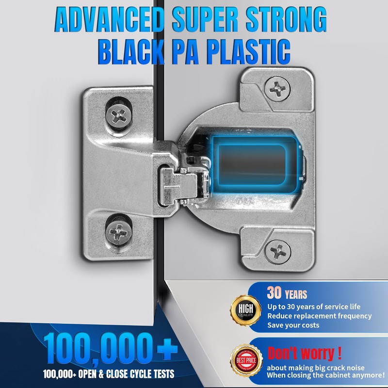 - Up to 30 Years of Service Life: The replacements for blum 30.310-11.02 hinges are crafted from ultra-hard, high-density PA plastic, which provides exceptional impact resistance. This material effectively withstands daily collisions and wear, significantly extending the hinges' service life. The cabinet hinges have successfully passed over 100,000 opening and closing cycles without experiencing issues like plastic breakage or cracking. Additionally, the heavy-duty Zamak zinc alloy ensures robust, reliable structures, offering outstanding durability&strength. Nickel-plated surface layers further enhance corrosion resistance, ensuring smooth hinge operation & prolonging their overall lifespan.