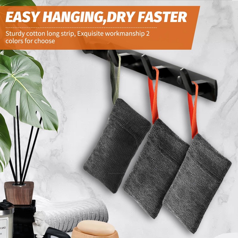 - Hangable Design: In order to ensure that soap scrubber pouch can dry quickly after use and avoid breeding bacteria, our soap bag is specially designed with a hangable function. Each exfoliating soap bag is equipped with a sturdy lanyard, which can be easily hung on the hook in the bathroom for ventilation and drying.
