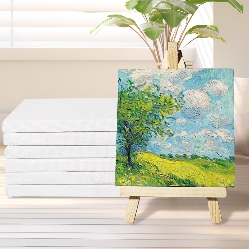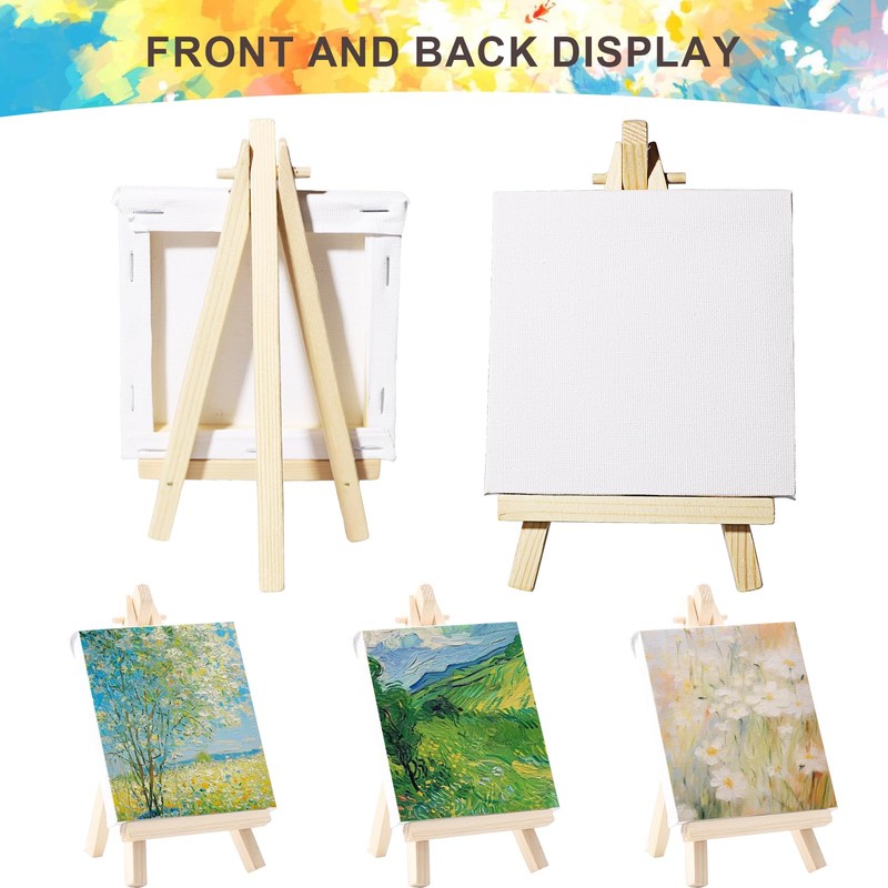 - All-rounder portable: mini painting set with 8 mini canvas boards (10 x 10 cm) and 8 mini wooden easels (16 x 9 cm). Lightweight and portable. The triangle easel with A-shaped structure guarantees stability and non-slip grip, tiltable for different painting positions.