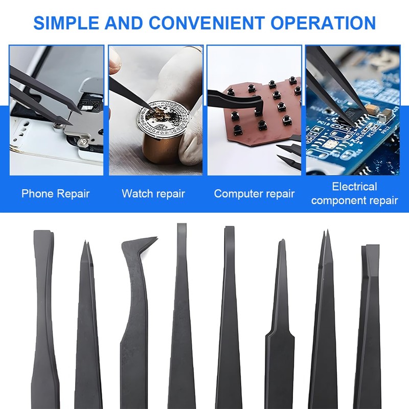 • Anti-static Design These tweezers are made of carbon fiber plastic, which prevents the transmission of static electricity and effectively protects electronic components during installation and use.