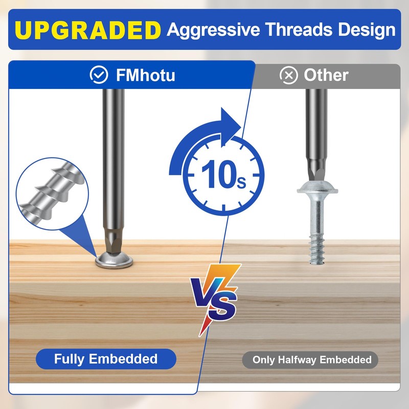 - 【Upgraded Coarse Thread】: The screws boast an upgraded coarse thread that offers increased power and efficiency, requiring 40% less effort during drilling. Ideal for use with treated lumber like cabinets and tables, though a pilot hole is recommended.
