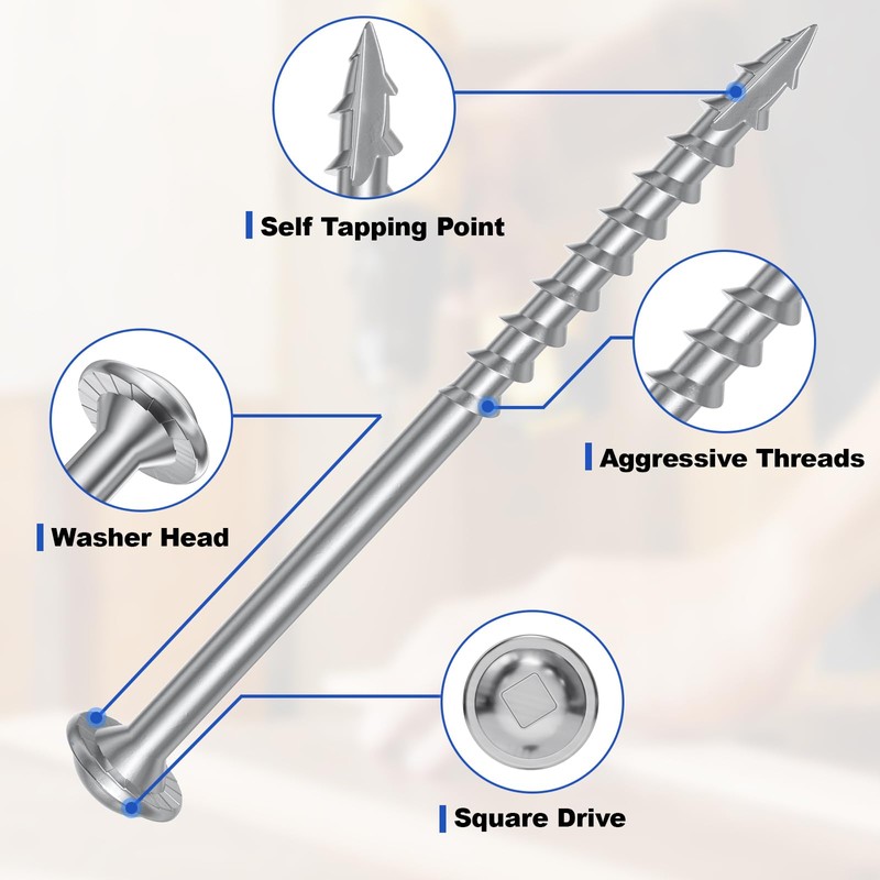 - 【Square Drive Design】: The deep square shape of the screws ensures a secure grip with the drive bit, with four square edges reducing torque for smooth driving and minimizing the risk of stripping.