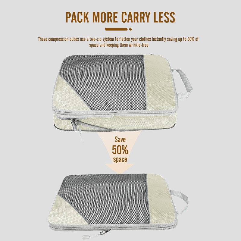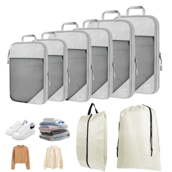 8 Set Compression Packing Cubes for Travel, Expandable Luggage Organizer with Shoe Bag & Laundry Bag - Lightweight Suitcase & Backpack Travel Essentials (Beige)