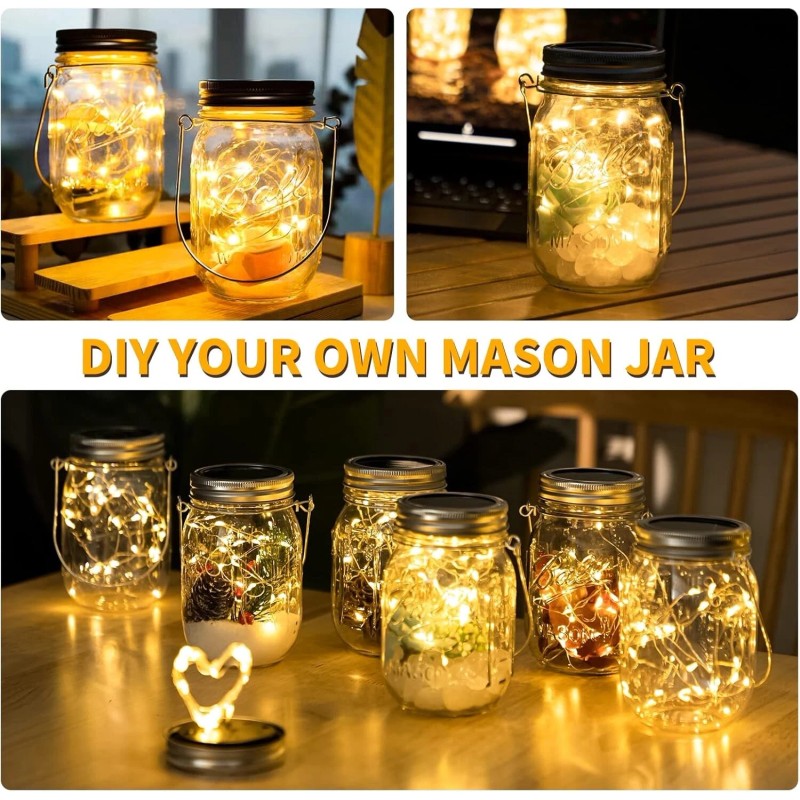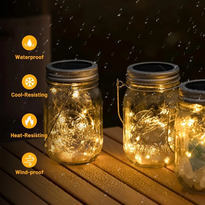 - Safe and Waterproof: Solar powered, easy to use, no wires required, no extra bill; Good heat dissipation, cool and safe to touch without risk of burns; The solar mason jar lights are waterproof, so there is no need to take inside during rainy or light snow days but cannot be totally submerged in water; Great for indoor and outdoor use; Perfect for wedding, party, BBQ, picnic, home, balcony, fence, driveway, garden and tree decor, the night looks with jars of "fireflies" lighting up your space