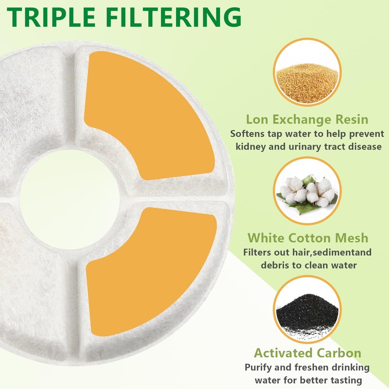 - 💧[Triple-Action Filter]:Der Wasserspenderfilter verfügt über 3 Filterschichten, hochwertige Baumwolle kann Haare und Unreinheiten isolieren, Kokosnussschalen-Aktivkohle kann Gerüche im Wasser entfernen, Harz kann Wasser weicher machen und Schwermetalle entfernen und so gesundes Trinkwasser für Haustiere bereitstellen.