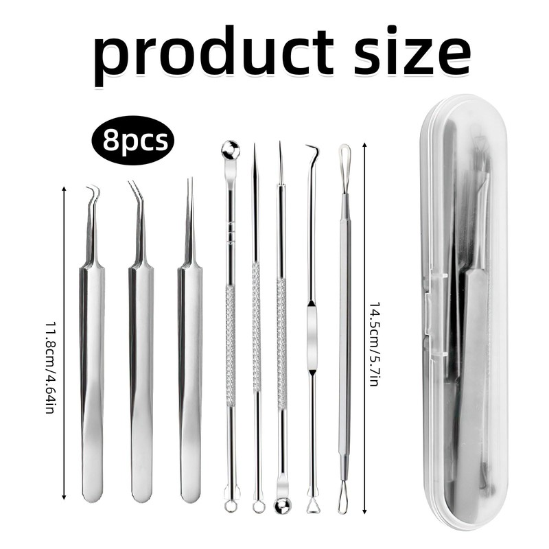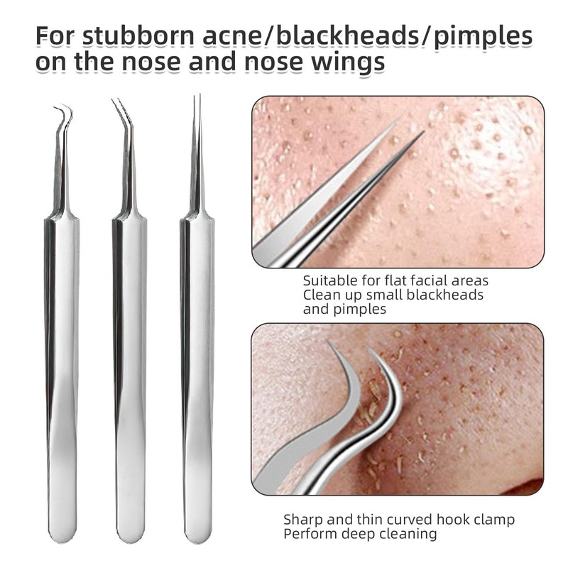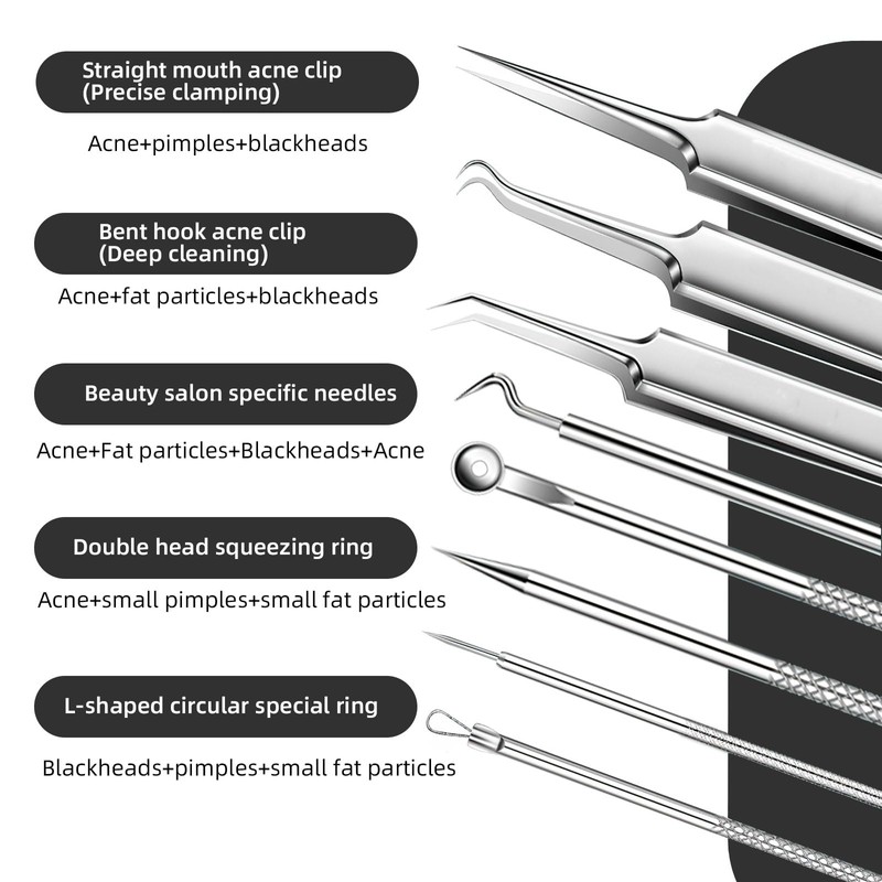 • Präzises Multifunktionsdesign: Spezialwerkzeuge wie Mitesser-Pinzette (Mitesser Pinzette) und doppelseitige Extrakoren entfernen hartnäckige Mitesser (Mitesser entfernen), Akne und Unreinheiten präzise. Rutschfeste Griffe ermöglichen kontrollierte Anwendung für schonende Mitesserentferner (Mitesserentferner)-Prozesse ohne Narben.