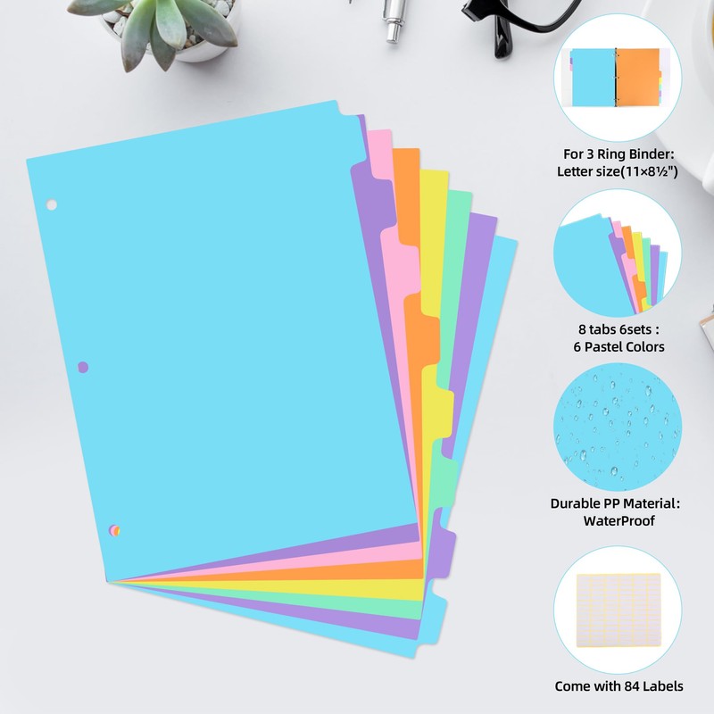 8-tabs 6 Set Binder Dividers with Tabs,Plastic Index with Label,Colorful Dividers for 3 Ring Binder (48)