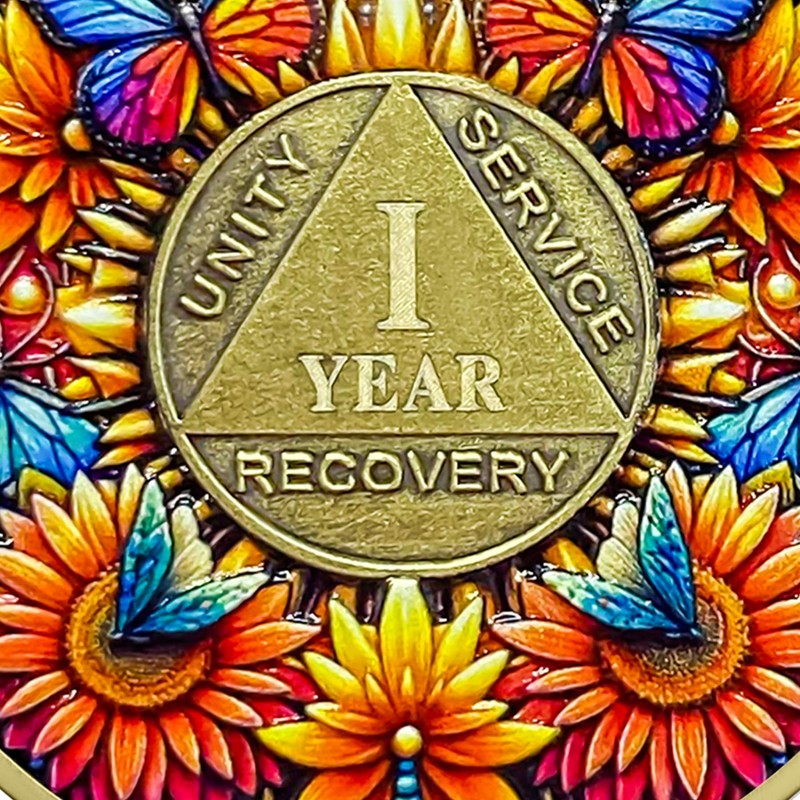 - Front and Back Design: Front Design: Features a vibrant array of sunflowers and butterflies, with the text "1 YEAR RECOVERY" at the center, surrounded by "UNITY", "SERVICE", and "RECOVERY". Back Design: Showcases a serene scene of a person rowing a boat towards a bright sun, symbolizing the journey of recovery. The phrase "ONE DAY AT A TIME" is prominently displayed at the top, and "SOBER" at the bottom.