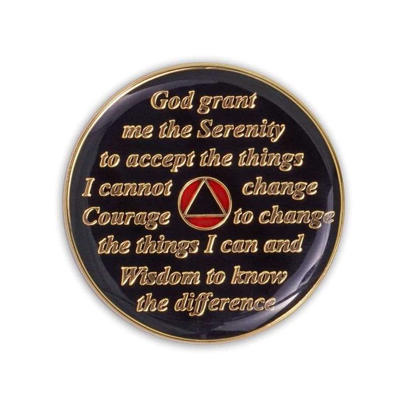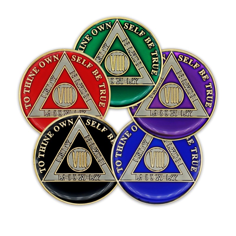 Eight year AA coins from The Token Shop celebrate sobriety and feature messages of AA fellowship which serve as powerful reminders to live the program, one day at a time, with an honest daily inventory. These classic medallions are available in five vibrant colors: Red, Blue, Green, Purple, and Black. Commemorative Alcoholics Anonymous chips feature the AA circle and triangle motif with one of three AA legacies on each side: Recovery, Unity, and Service. The motif is silver with gold outlines. The famous quote “To thine own self be true” is embossed along the top curved edge on the front side of the coin. The back side of these sobriety chips feature the Serenity Prayer “God grant me the serenity to accept the things I cannot change, the courage to change the things I can, and the wisdom to know the difference.” The prayer is featured in gold on a black background surrounding a small circle triangle with a touch of color. This AA chip is truly a one-of-a-kind inspirational gift to celebrate recovery in style! Recovery coins make excellent recovery gifts for a loved one celebrating eight years sober. They can carry the token with them always to symbolize the journey they have traveled as well as a reminder of your love and continued support of their sobriety. Our triplate sobriety tokens are custom designed in house and made with the highest quality materials. The process begins with multi-step proofing. Multistage plating with 24k gold and soft enamel colorization on stamped brass create bold, vibrant AA chips and medallions. A high gloss epoxy dome creates an incredibly smooth, strong, and durable finish on both sides. Finally, each AA medallion piece is hand polished and packaged in a protective vinyl pouch. These are unique sobriety gifts for men and women in twelve step programs celebrating their soberversary. Gift wrapping is available for all of our AA recovery gifts upon checkout.