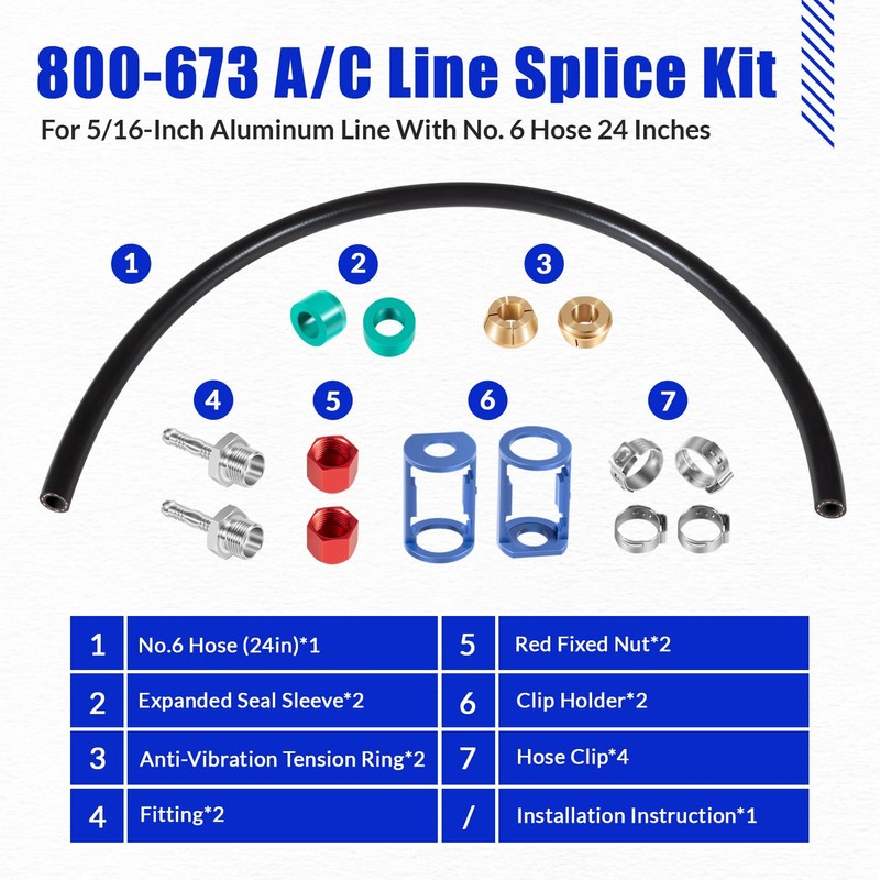 - 【Complete Kit for Reliable Splicing】Includes all necessary components: No. 6 Hose (24 inches), Red Fixed Nuts (x2), Fittings (x2), Clips (x4), Clip Holders (x2), Expanded Seal Sleeves (x2), and Anti-vibration Tension Rings (x2). Ensures a secure and leak-free connection for long-lasting performance. Also includes an instruction for detailed Installation