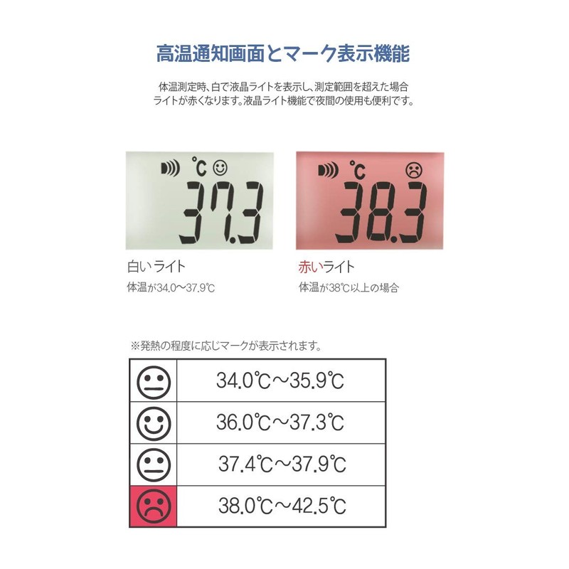 - 発熱のアラーム:体温が38℃以上の時は、アラームと赤色のライトが点灯します。