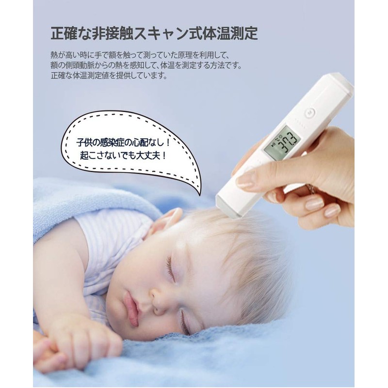 - 体温計モード:スキャン式で額全体の温度を測定し、その最大値を表示するため、より正確な検温ができます。