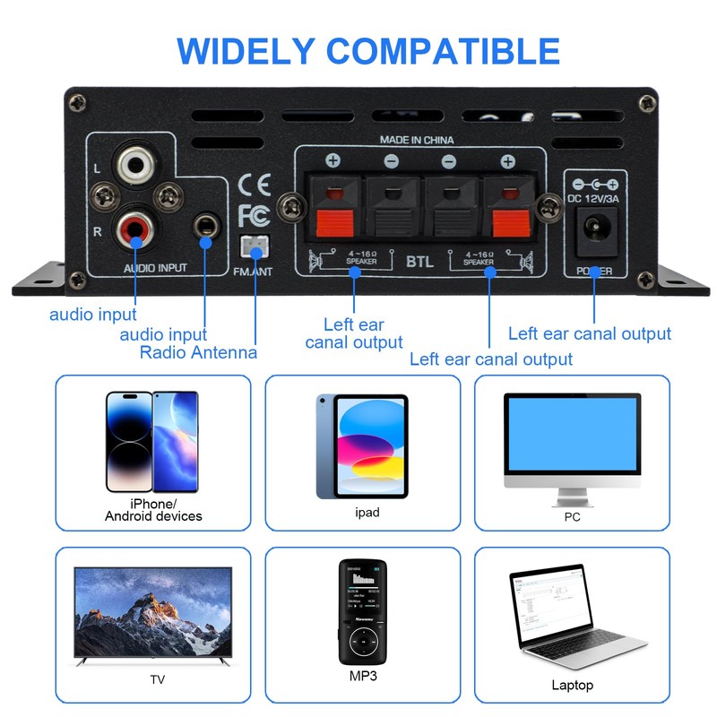 - Compact and Powerful: The small home amplifier supports various external sources. 3.5 Input, MP3, USB, Microphone, AUX, FM radio antenna, with a digital LCD and music output dynamic level indicator.