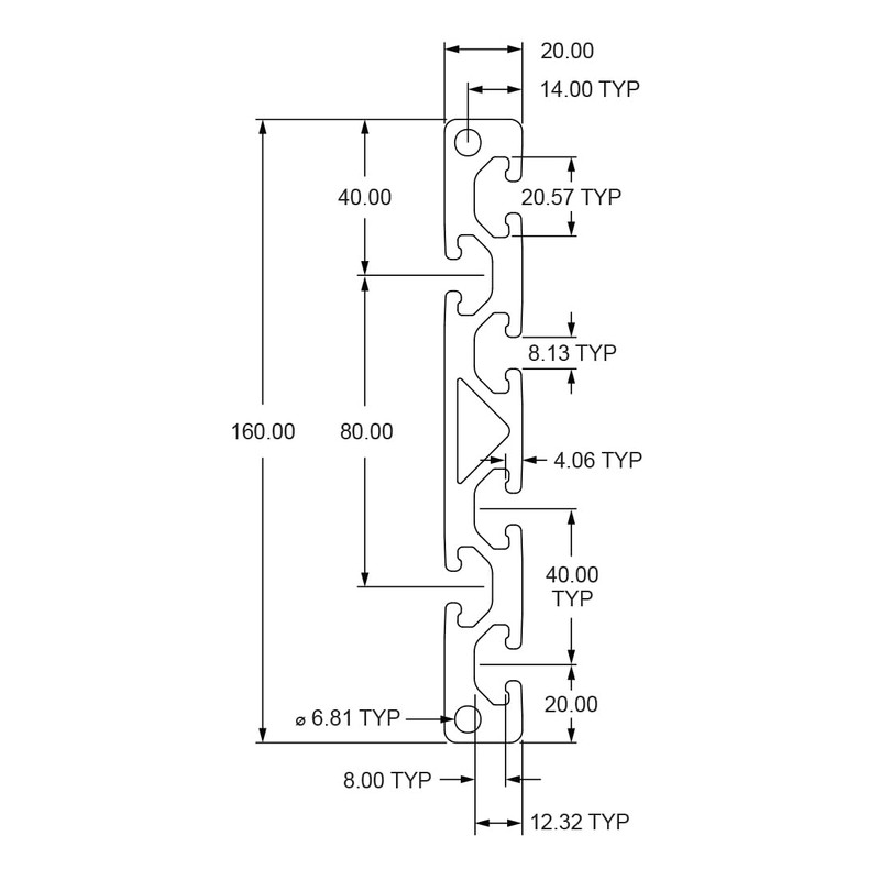 - 40 Series 8020 Modular Extrusion with six open t-slots to accommodate 40mm x 40mm based joining plates, brackets, and accessories.