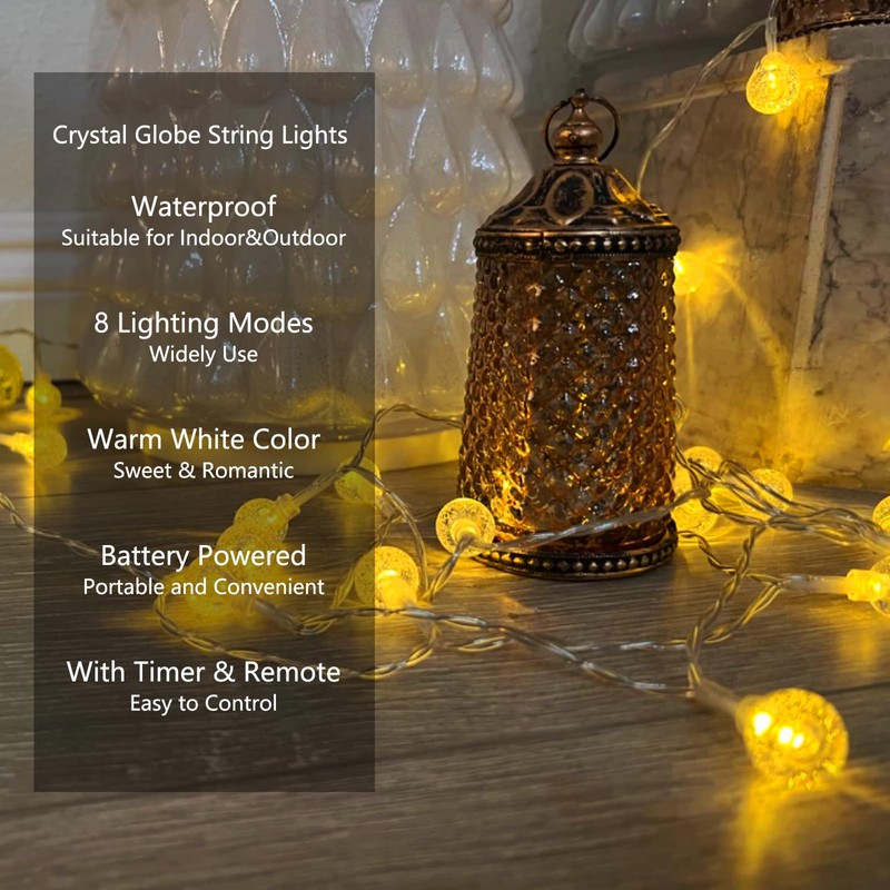 • 2024 New Upgraded Mini Christmas Lights with Remote: 80 LED super bright crystal globe string lights, 8 Lighting Modes & Memory Function & Remote & Timer to meet your decorative needs.