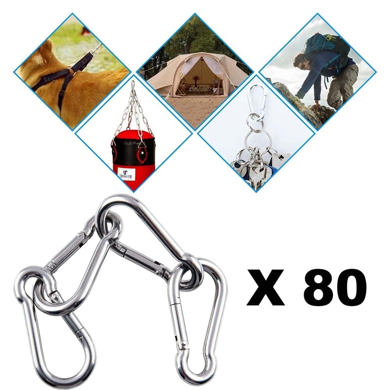 - PACKAGE INCLUDE:80 pieces of carefully crafted spring snap hooks. Not suitable for climbing, great for backpacks, key rings, chains, ropes, camping, hiking, fishing, pets, indoor and outdoor equipment gear