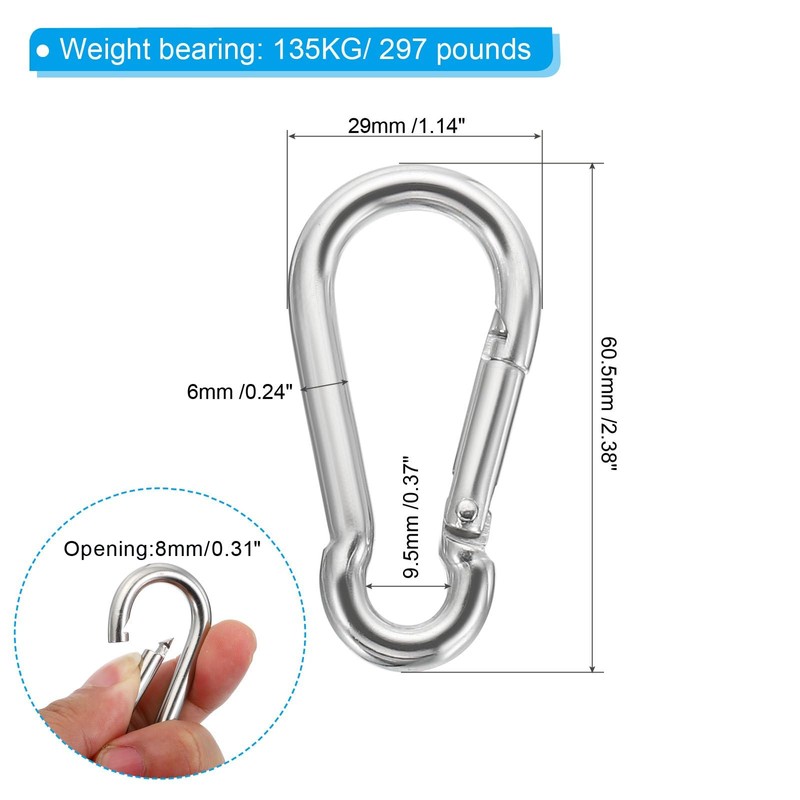 - HEAVY DUTY:Carabiner clips are 2-3/8 inches (60mm) long; 0.24 inches thick. Load capacity is up to 135 kg/290 lbs. Rigid construction ensures the stability and strength of the clip and prevents the rope from falling off or the clip from unclipping itself