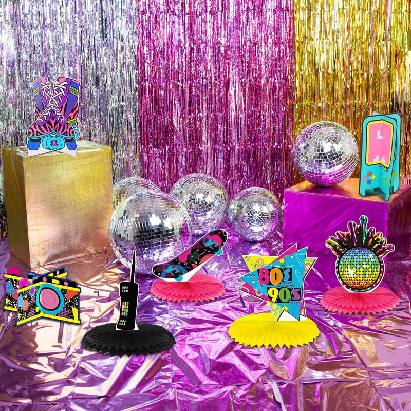 - Value package:comes with 12pcs retro party decorations,including 8pcs 80's 90's honeycomb centerpieces,4pcs table toppers,sufficient amount and double-sided design make them more eye-catching,and gives you a wonderful visual experience.