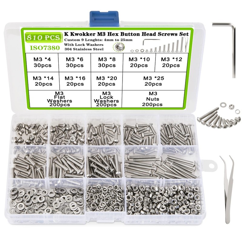 810Pcs M3 Hex Button Head Machine Screws, 4mm to 25mm 9 Length Bolts and Nuts Kit with Lock Washers, K Kwokker 304 Stainless Steel Set Screw Assortment Kit, Metric Screw Assortment, w/Key, Tweezer